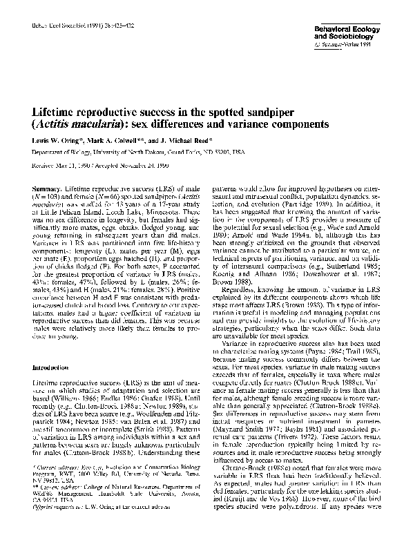 Pdf Lifetime Reproductive Success In The Spotted Sandpiper Actitis Macularia Sex Differences And Variance Components Lewis Oring Academia Edu